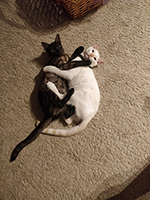 Tras meditarlo mucho, decidimos adoptar un gato y, al visitar la protectora con nuestra hija, coincidimos con una familia conocida, que estaba haciendo de hogar de acogida de un cachorro. Toda su familia había sido rescatada de un polígono industrial, donde tanto la madre como su camada habían sido disparados con perdigones. La madre sufre graves secuelas y finalmente ha encontrado un hogar gracias a un intercambio que realizan con Alemania donde podrá recibir todos los cuidados médicos y el hogar que necesita. Lina se ha integrado perfectamente con nosotros y además disfruta de la compañía de su gran compañero Pelito, del que no puede ser más diferente pero increíblemente inseparable.