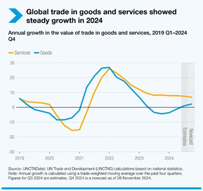 Ambos sectores registraron un repunte de los valores comerciales en el tercer trimestre, y se espera que el impulso se mantenga en el último trimestre del año, cuya tendencia -a falta de los datos definitivos de diciembre, dice el estudio- apunta a los 33 billones, una cifra próxima al PIB de EEUU. Las primeras estimaciones de la Unctad también señalan que las potencias de rentas altas superarán a los mercados emergentes y a las naciones en vías de desarrollo, apoyadas en sus demandas estables y en la mejoría de las condiciones empresariales, como corroboran las excelentes cuentas de resultados de sus corporaciones en el último trimestre de 2024. También sus importaciones crecieron, en un 3% entre julio y septiembre, último trimestre contabilizado oficialmente por la Unctad.
